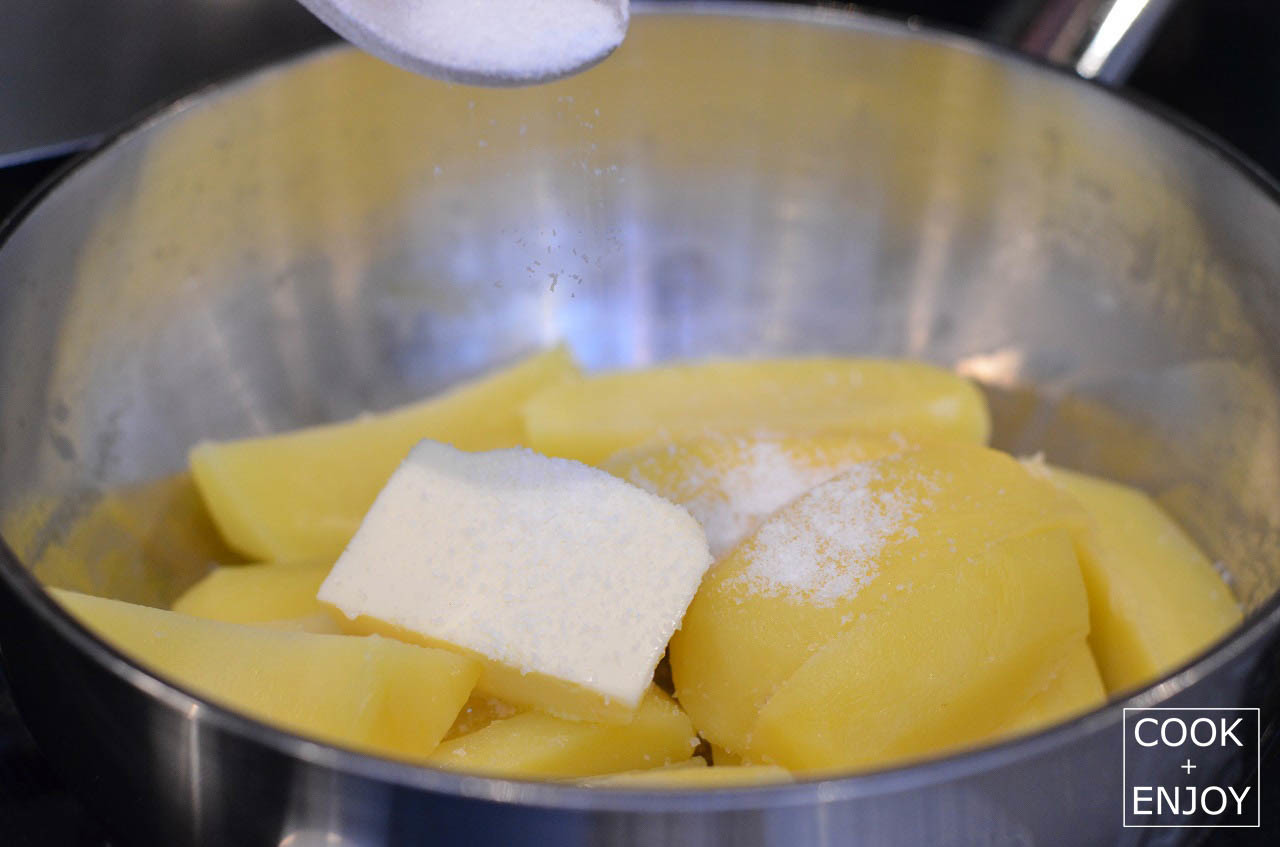 - Sahne dazugeben. Weiter zu einem glatten Püree stampfen.